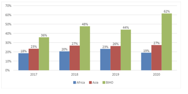 Recently, BRAC International commissioned an action research on women’s leadership to understand the status quo and gaps in regards to promoting women leadership and women-friendly culture within the organisation. It also enabled us to identify required actions to be taken for addressing those gaps and challenges. HR and hiring managers were recommended to think ‘outside the box’ on how to recruit more women in leadership positions, coupled with a recommendation to systematise mentoring to support women on staff to develop their leadership capacities and prepare them for promotion. These combined efforts have already paid off, resulting in an increased number of women in senior leadership positions (see figure below).