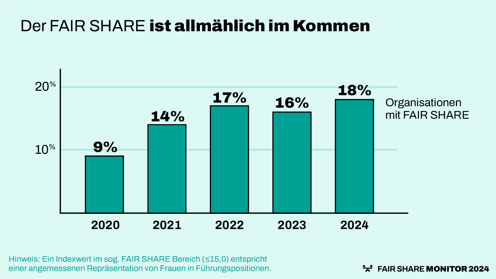 Der Anteil beträgt in diesem Jahr im Durchschnitt 42%. Natürlich ist dieser Wert mit Blick auf den Frauenanteil in den Belegschaften von 69% noch weit entfernt von einer angemessenen Repräsentation, doch handelt es sich bei dem Weg zu Geschlechtergerechtigkeit bedauerlicherweise um einen Marathon und das Wahrnehmen von Meilensteinen auf ebendiesem Weg steigert die Durchhaltefähigkeit.