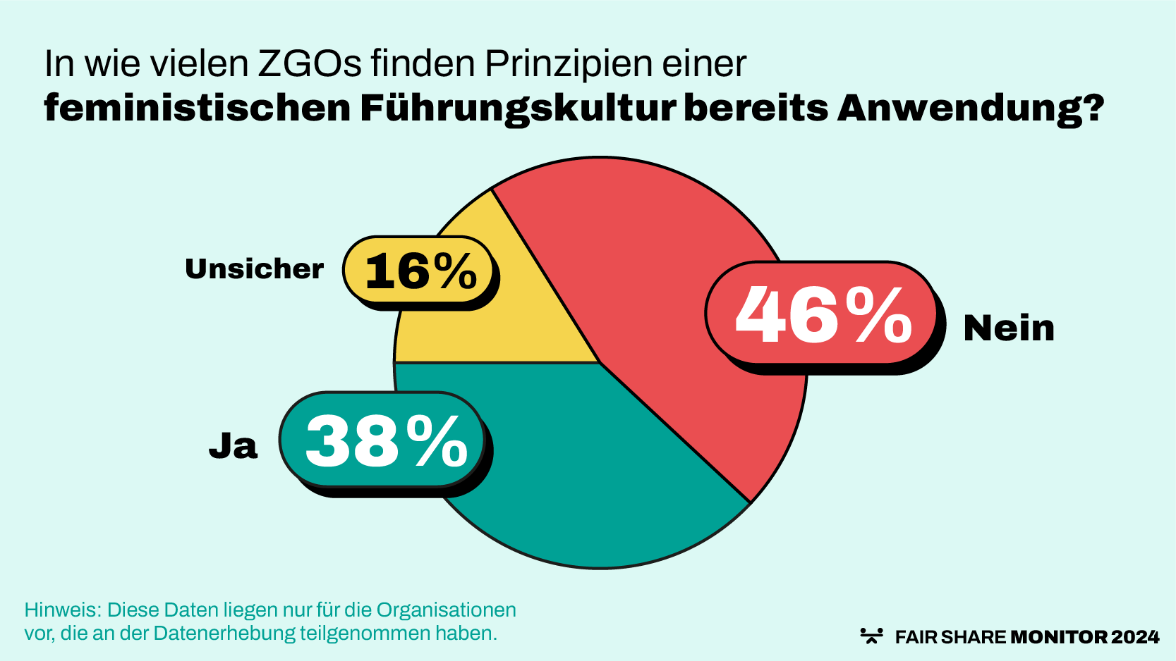 Die Vision von FAIR SHARE ist eine Zivilgesellschaft, die die Werte von Gerechtigkeit und Teilhabe auch in den eigenen Strukturen und Kulturen lebt. Der Wandel in diese Richtung sollte sich idealerweise auf feministische Prinzipien stützen, sodass wir die teilnehmenden ZGOs gefragt haben, inwiefern feminist leadership in ihrer Führungskultur Anwendung findet. Von den 107 ZGOs, die den Fragebogen ausfüllten, konnten 38% diese Frage mit Ja beantworten. 29 ZGOs nahmen sich ferner die Zeit, ihre Führungskultur in einem Freitext nochmals detaillierter zu beschreiben.