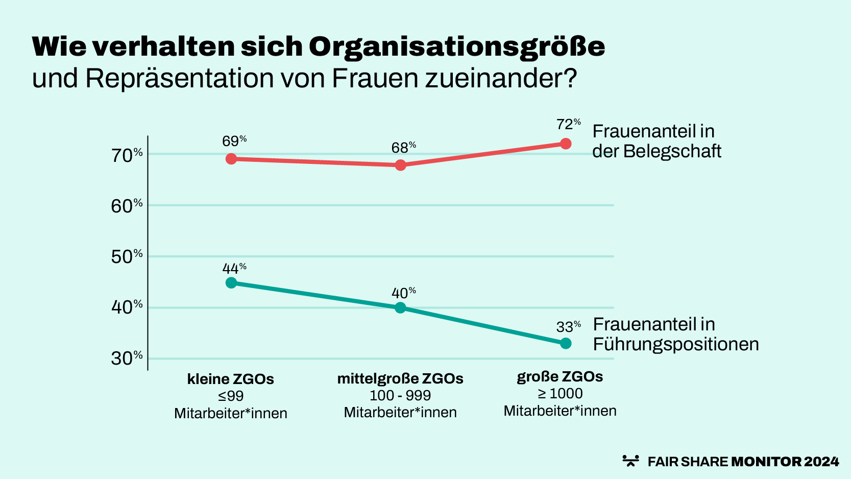 Im FAIR SHARE Monitor 2024 gab es einige Neuerungen und Veränderungen. So wurde dieses Jahr erstmals auch die mittlere Führungsebene in den Blick genommen. Als Arbeitsdefinition legten wir für diese Personengruppe fest, dass sie zwar als Führungskräfte gezählt werden, aber nicht zur formalen Geschäftsführung und-leitung (der obersten Führungsebene) gehören. Hier ergab sich unter den teilnehmenden ZGO ein Verhältnis von durchschnittlich 62% Frauen zu 38% Männern. Ein beträchtlicher Talentpool an Personen mit Führungsverantwortung wäre demnach vorhanden, aber zahlenmäßig findet sich dieses Potential in der höchsten formalen Führungsebene nicht wieder. Dieser Diskrepanz möchten wir in Zukunft noch näher auf den Grund gehen und verstehen, wie Führungspositionen besetzt werden.