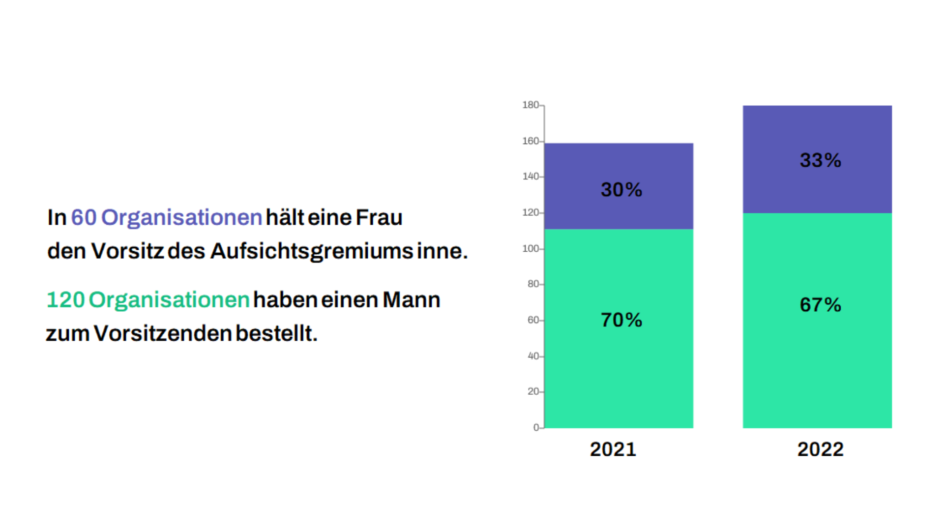 Es lässt sich ein leichter Anstieg bei der Zahl der Frauen, die als Vorsitzende eines Aufsichtsgremiums fungieren, verzeichnen. Hierbei werden jedoch nur die tatsächlichen vorsitzenden Personen berücksichtigt. Stellvertreter*innen werden nicht gesondert untersucht, stattdessen werden sie zu den weiteren Mitgliedern des Gremiums gezählt und werden damit nur im generellen Geschlechterverhältnis einkalkuliert.