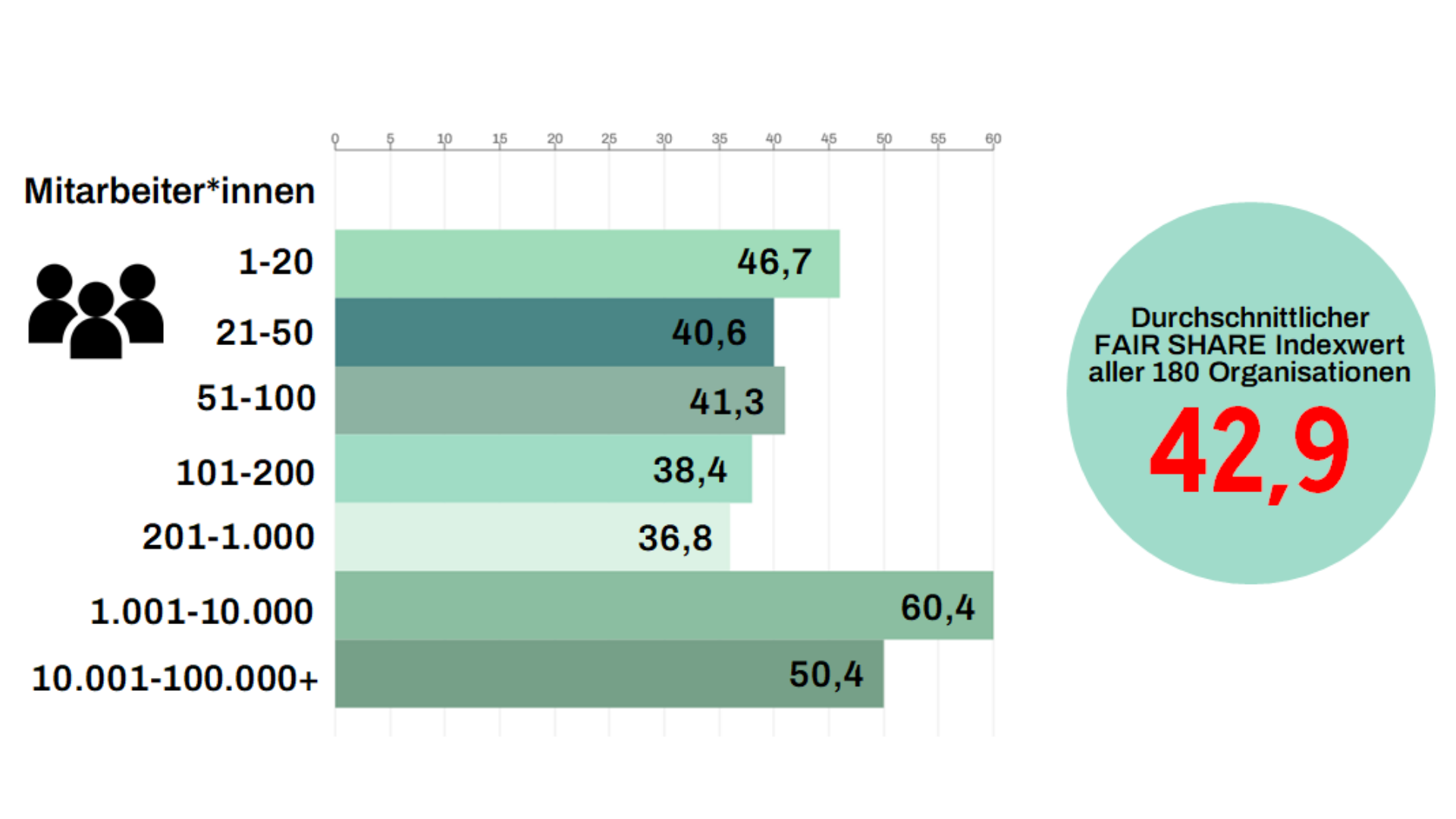 In Zukunft möchten wir die Organisationsgröße stärker als Unterscheidungskriterium hinzuziehen. Vor diesem Hintergrund haben wir aufgrund der Verteilung der Mitarbeiter*innenanzahl sechs Cluster bilden können und deren durchschnittlichen Indexwerte miteinander verglichen. Interessanterweise weisen NGOs und Stiftungen mit einer Belegschaft von 100 – 1.000 Personen mit 38,4 und 36,8 derzeit die besten FAIR SHARE Indexwerte vor, während kleinere Organisationen einen Durchschnittswert von mind. 40 erzielen. Die großen Ausreißer sind in diesem Fall auch die mitarbeiter*innenstärksten Organisationen, wobei sich ab der Grenze von 10.000 Beschäftigten der Indexwert von 604, auf 50,4 nochmals deutlich reduziert.
